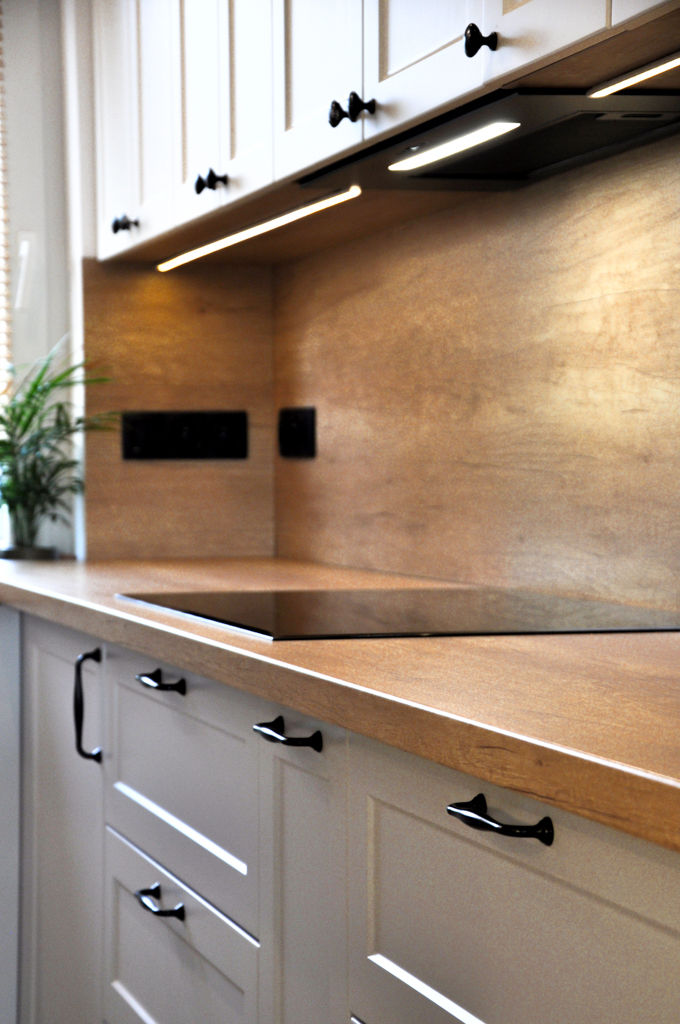 Efektem jest funkcjonalna, jasna kuchnia w klasycznym stylu, łącząca ciepło drewna z nowoczesną wygodą.